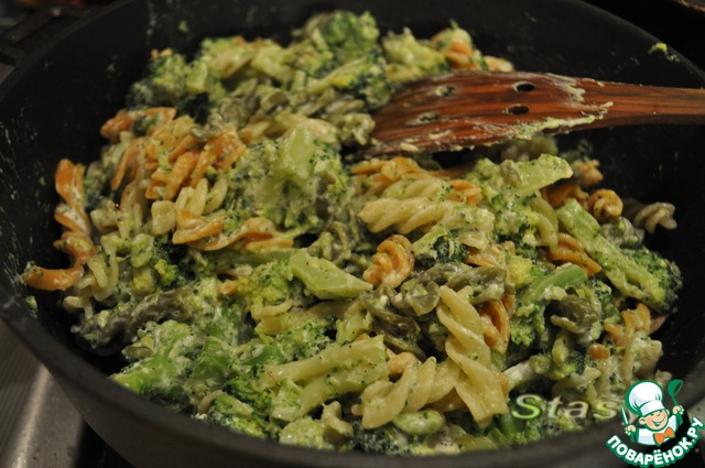На сковороде разогреть немного оливкового масла, выложить брокколи и макароны, перемешать, прогреть пару минут. Ввести творожную массу, всё хорошенько перемешать, ещё немного подержать на сковороде, после чего выключить огонь. Можно подавать!