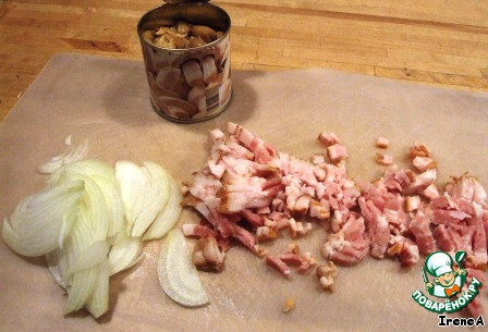 Когда мой кабачок был готов, я дала ему остыть минут десять, в это время нарезала бекон и лук. Духовку не выключала - она нам ещё будет нужна.