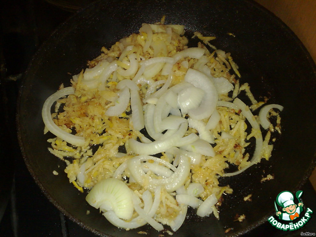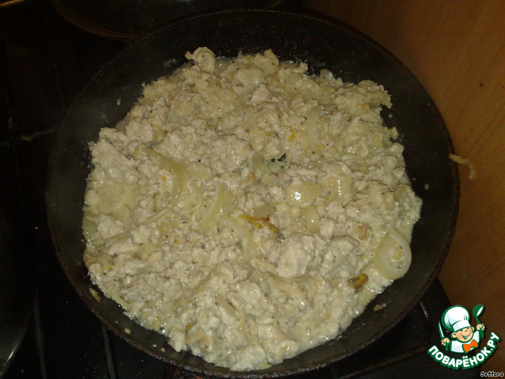 Когда овощи станут мягкими, солим, перчим и добавляем фарш (куриное филе, лук, соль, перец).