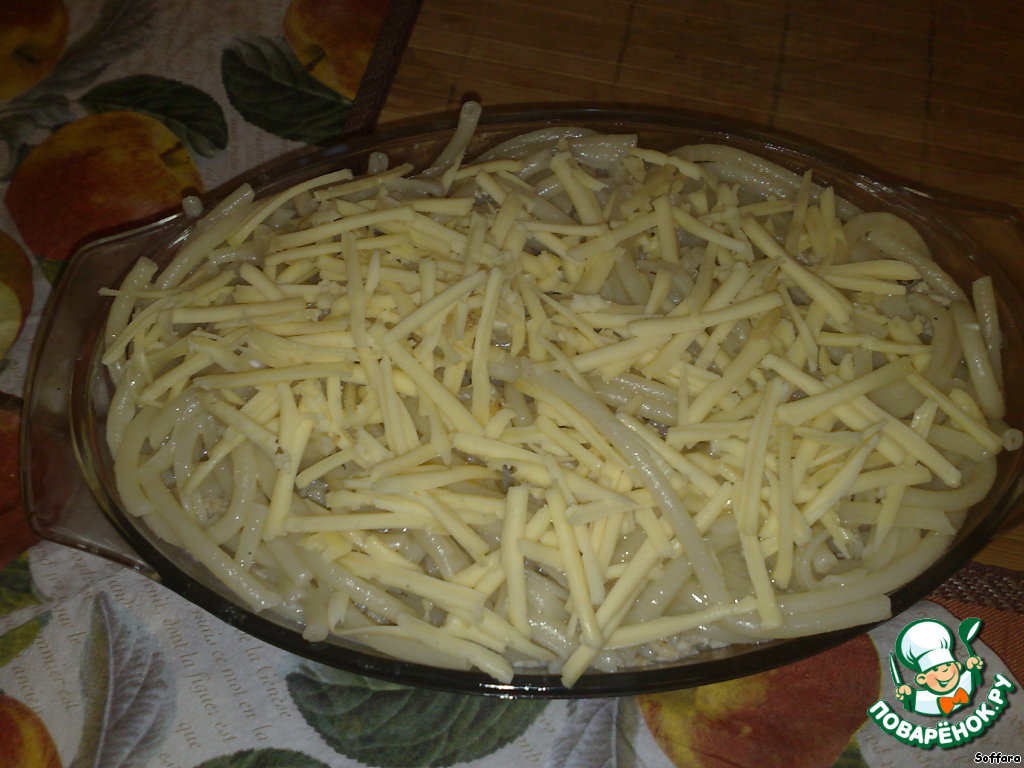 В форму для запекания выкладываем слоями: 1 слой - макароны с сыром,