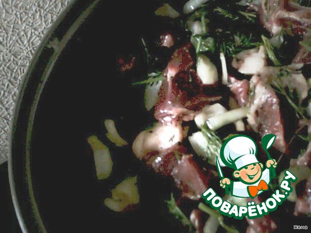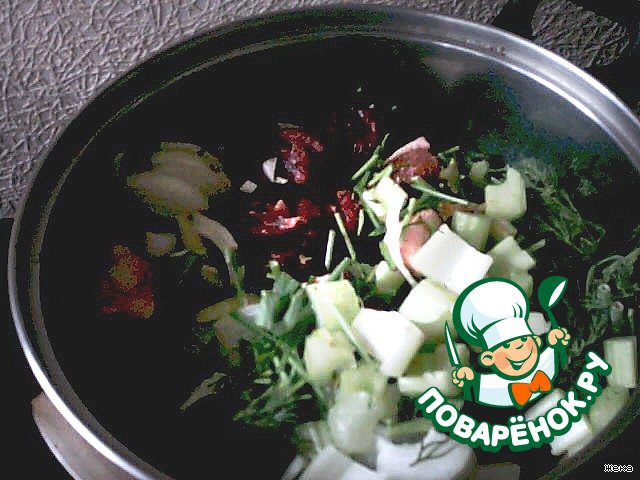 Нарезать кусочками по 30 -40 гр. , Зелень порезать не очень мелко. Орехи поджарить на сухой сковороде. Все уложить в кастрюльку добавить соус, сок лимона, масло, все помешать и оставить на часик отдыхать(мариноваться).