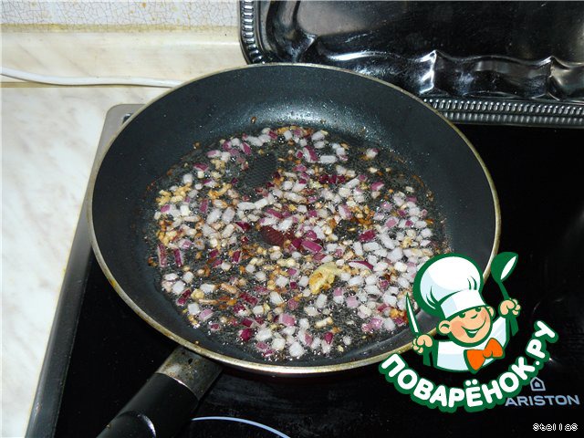 Лук мелко режем. Я брала красный, но можно брать и обычный. Чеснок выдавливаем через чесночницу, и все это пассеруем на сковороде.