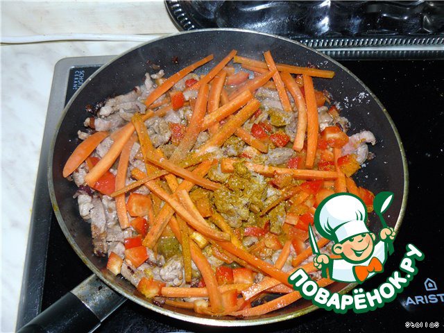 Все это подрумяниваем, уменьшаем огонь. Добавляем 1 ч. ложку молотого имбиря и 1 ч. ложку карри. Наливаем стакан воды и тушим до готовности.