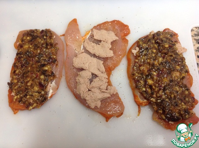 Я на фаршировала несколько филе сыром. Хочу уточнить, что я купила филе индейки в острой паприке, поэтому края красные.