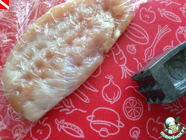 Завернув в пищевую пленку, отбиваем филе с обеих сторон,