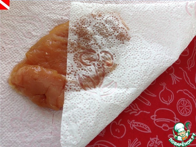 Замаринованное куриное филе необходимо промокнуть бумажным полотенцем,