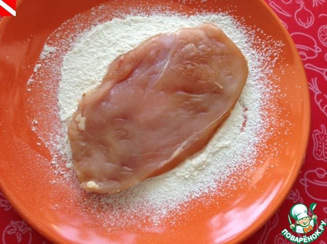 Подготовим куриное филе - каждую часть разрежем напополам, обсушим бумажным полотенцем.