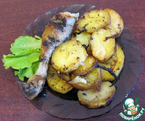 Все это в духовку, картошку на противне вниз, курицу на решетке сверху.