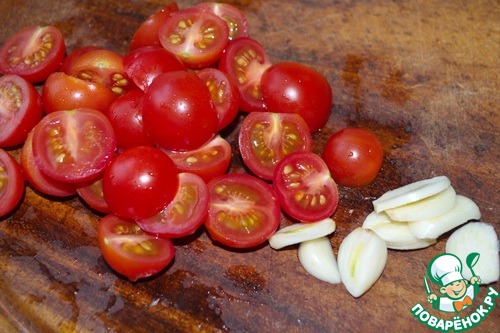 Чеснок чистим и режим перьями. Томаты черри пополам.