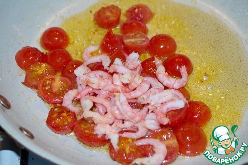 Поверх этой смеси выложим очищенные креветки (они были уже сварены) и обжарим буквально 1 минуту.
