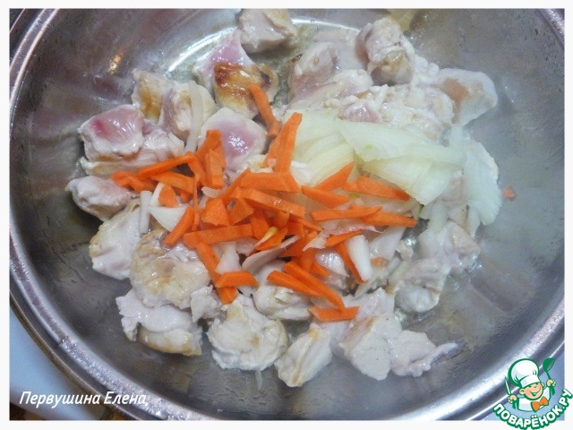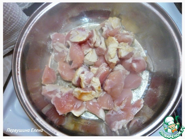 Мясо нарезаем порционными кусочками и обжариваем на растительном масле до золотистого цвета.