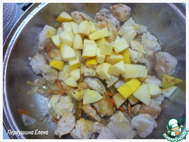 Айву очищаем и нарезаем не очень маленькими кубиками. Добавляем к мясу.