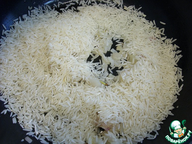 Всыпать рис, помешивая, жарить несколько секунд, пока он не станет прозрачным.