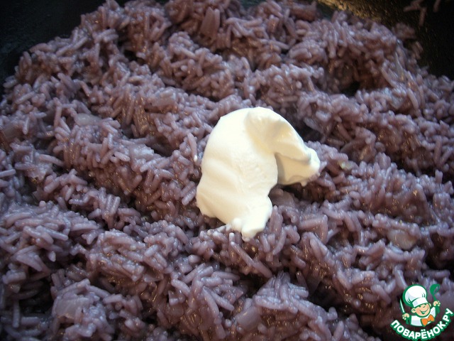 Готовый рис снять с огня, добавить 1 ч. л. сметаны, соль (если бульон несоленый), перец, перемешать.