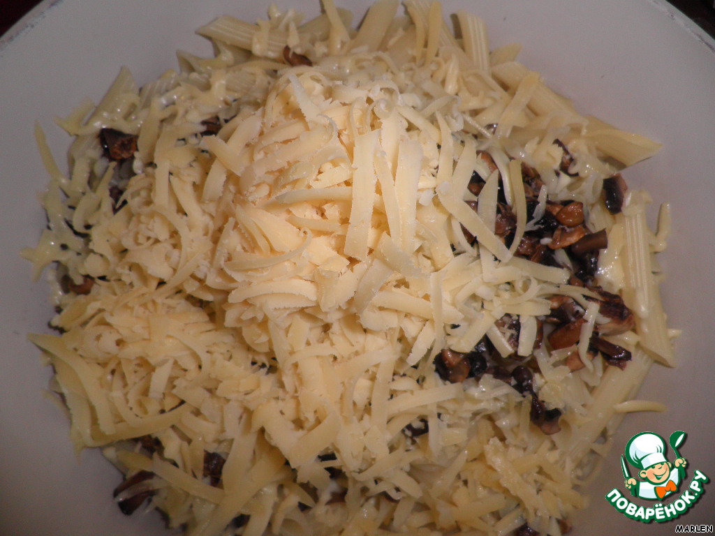 Сыр натереть на крупной терке и тоже добавить к макаронам.