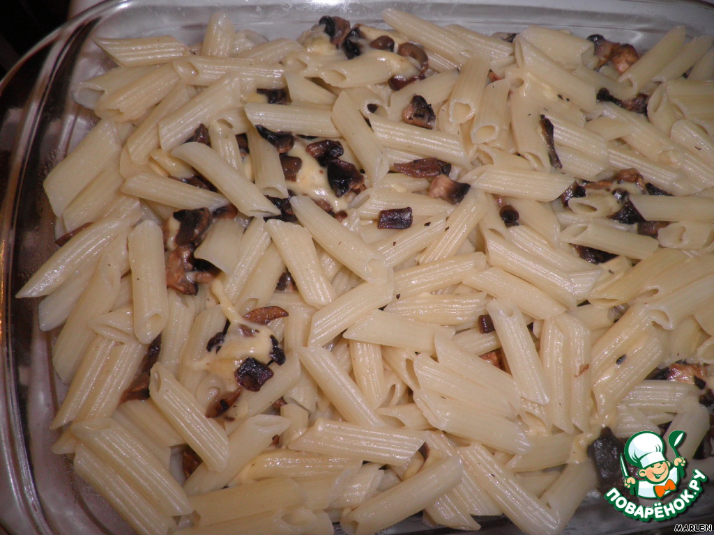 Грибы мелко нарезать и обжарить 5-7 минут, посолить. Затем добавить их к макаронам.