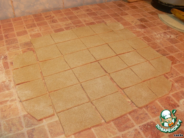 Раскатать тесто толщиной 1-1,5 мм. Разрезать на квадратики размером 3х3 см.