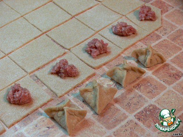 На каждый квадратик выложить немного фарша, все четыре уголка собрать в центре и защипнуть. Получатся маленькие "конвертики".