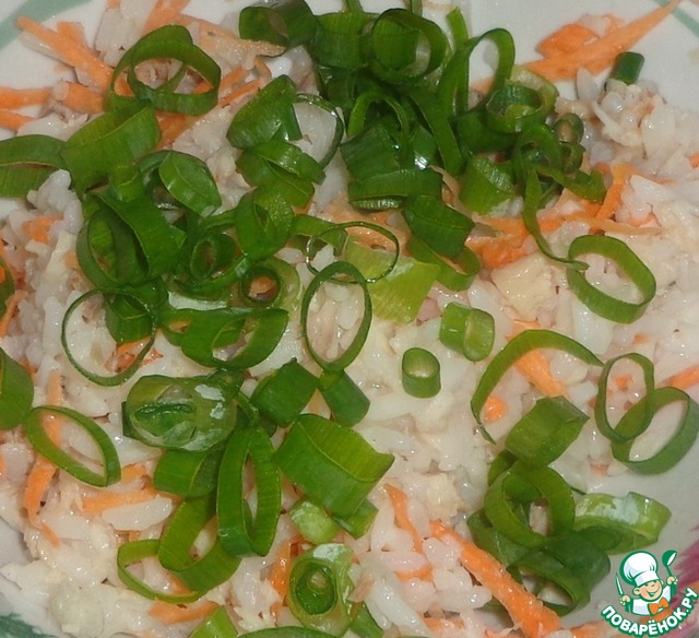 Отварной рис смешиваем с измельченным рыбным филе.