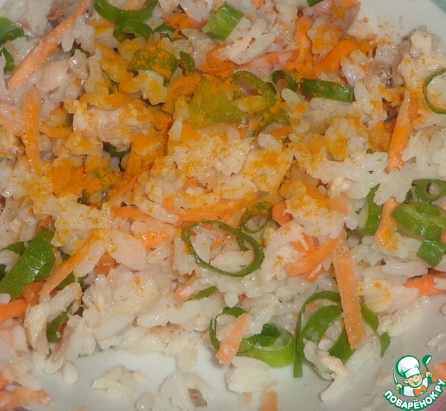 Добавляем куркуму, чтобы начинка стала яркой и праздничной. Солим и перчим по вкусу.