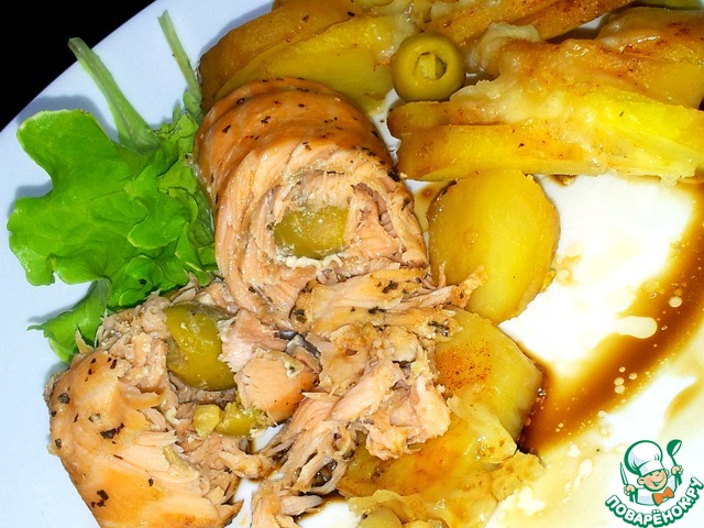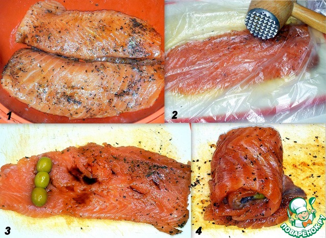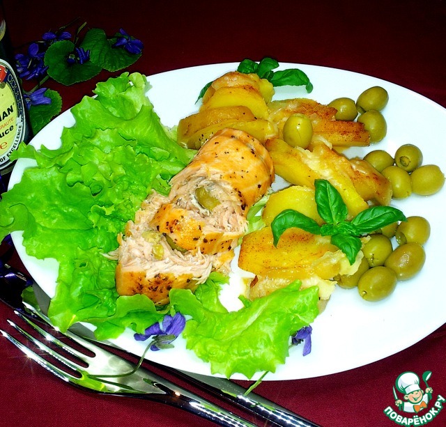 Каждую часть немного отбила накрыв плёнкой. Отбитые части филе полила соусом и распределила его по всей поверхности. На край положила три оливки и скрутила в рулетик. Получилось 4 рулетика.