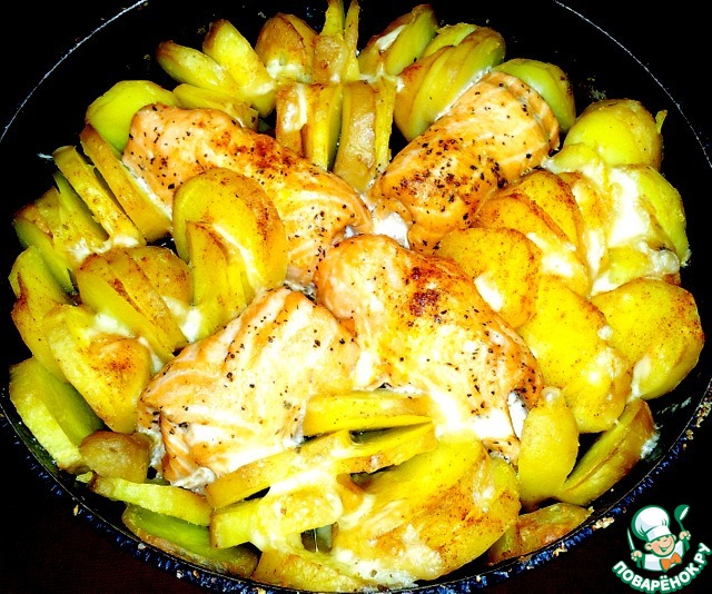 | Лосось запечённый с картофелем. Сочный лосось с нежным ароматом приправ. Вкусный, лёгкий ужин! |