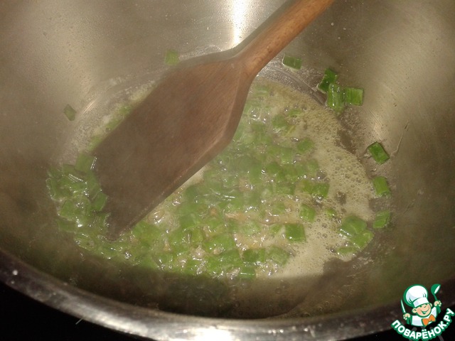 Шпинат нарезать, добавить к луку, посолить, поперчить, готовить до мягкости шпината и выпаривания жидкости.