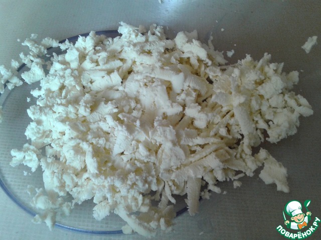 Фету натереть на крупной терке. Перемешать с чуть подостывшей овощной смесью.