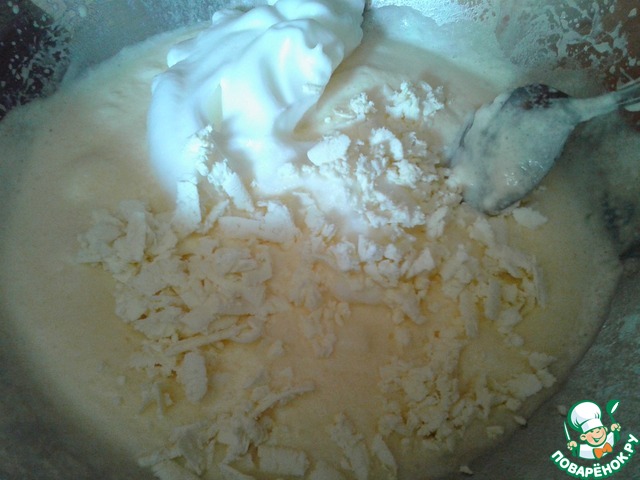 Белки взбить до твердых пиков. Аккуратно смешать с желтками.