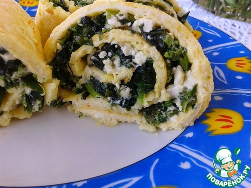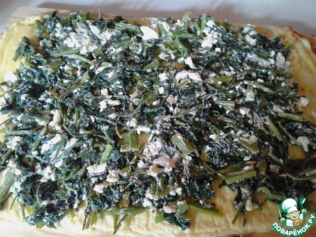 Выложить начинку, отступя 1,5-2 см от краев и свернуть рулетом.