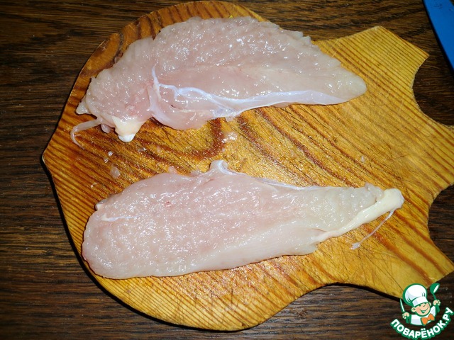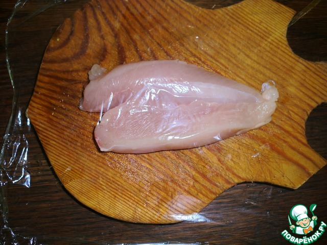 Куриное филе режем на небольшие кусочки и отбиваем. Походя даю совет: перед тем, как начать отбивать филе, накройте его пищевой пленкой - так нечего не брызжет и не разлетается)))