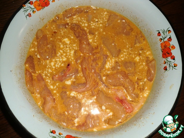 Складываем кусочки в кляр, перемешиваем. Пусть пока стоят так)
