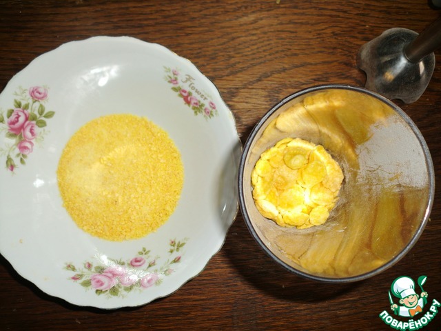 Займемся панировкой для курочки. Для этого измельчаем в крошку хлопья. Удобно это делать с помощью погружного блендера. Но можно размять и толкушкой, либо по немногу насыпать их в пакет и разминать скалкой.
