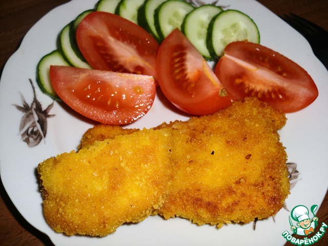 Дальше остается только обвалять филе в кукурузной крошке и обжарить на растительном масле с обеих сторон. Я жарю на среднем огне по 3-4 минуты с каждой стороны. Главное, чтобы хлопья не подгорели.