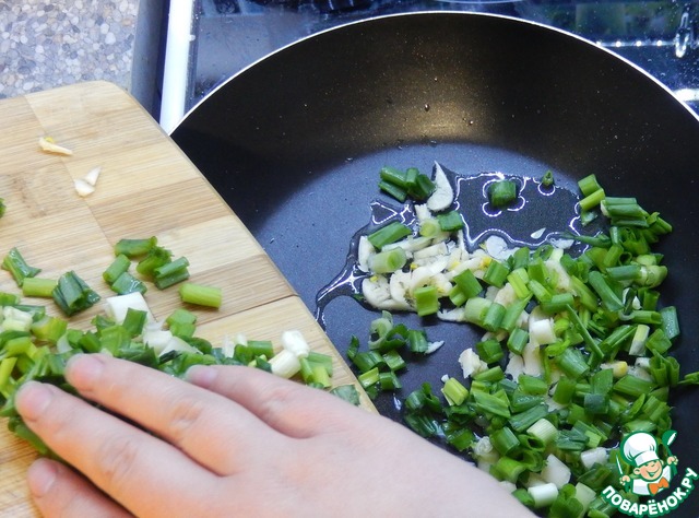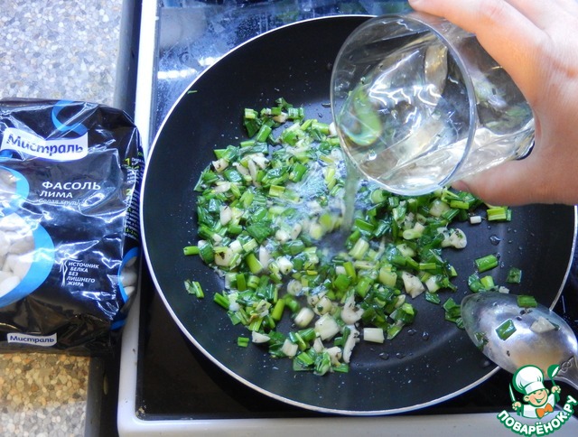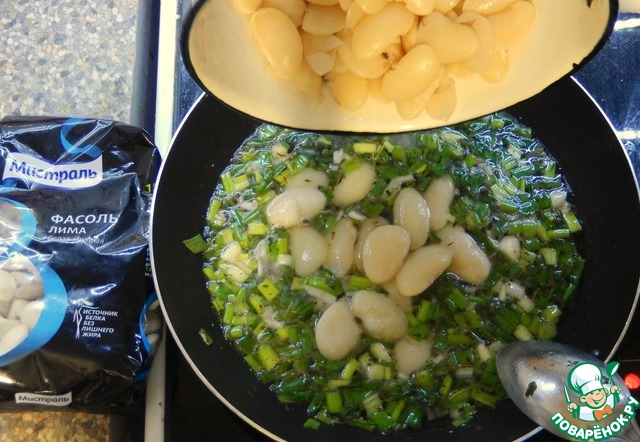Когда фасоль готова. Ставим на плиту сковороду, вливаем туда растительное масло. Чеснок и зеленый лук мелко режем, выкладываем на сковороду, добавляем тимьян. Тушим на маленьком огне пока лук не станет мягким.