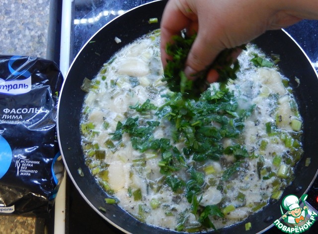 Петрушку мелко режем, немного оставляем для подачи. добавляем ее к фасоли. Перемешиваем снимаем с огня.