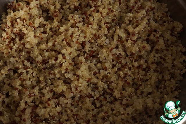 Киноа промыть, залить 300 мл. воды и отварить до готовности.