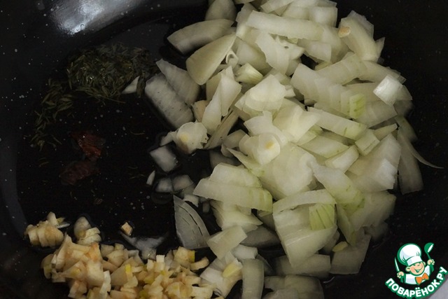 В сковороде разогреть масло и обжарить в нем лук, нарезанный четверть кольцами и измельченный чеснок. Добавить туда же перец и тимьян.