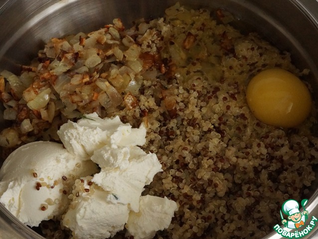 К киноа добавить обжаренную смесь, творожный сыр и яйцо, посолить поперчить. Перемешать.