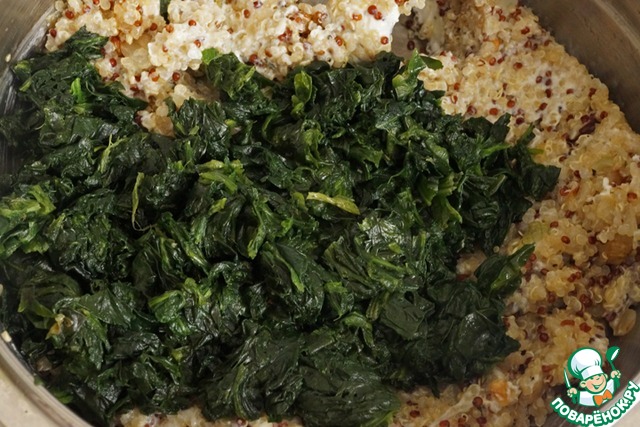Добавить измельченный шпинат. У меня был замороженный, поэтому я просто дала ему слегка оттаять и порезала. Если использовать свежий шпинат, то его нужно предварительно бланшировать.