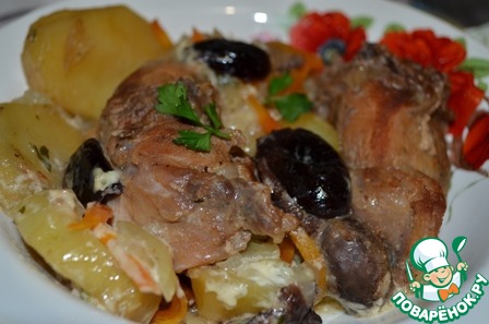 Каждый горшочек смазать растительным маслом, положить на дно мясо кролика, сверху на него морковь (порезанную соломкой), мелко порезанный лук, чернослив, картофель (слегка натереть его солью и приправами).