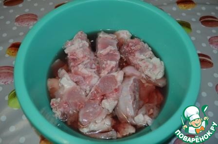Кролика порубить на небольшие кусочки, залить водой с уксусом (делаю на свой вкус-слабо-кисленький). Оставить в холодном месте на ночь.