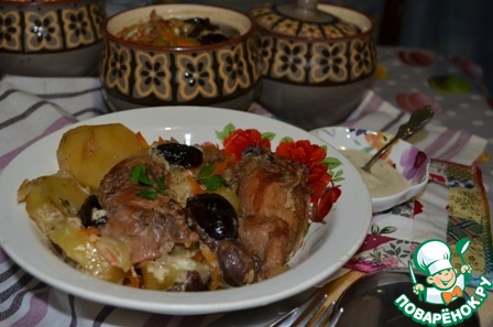 В каждый горшочек добавить 1/4 стакана воды. Закрыть горшочек крышкой и поставить в духовку с температурой 160 градусов, часа на полтора.