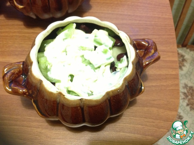 Затем болгарский перец и чесночно-майонезную смесь. Немного добавить кипяченой воды и слегка подсолить