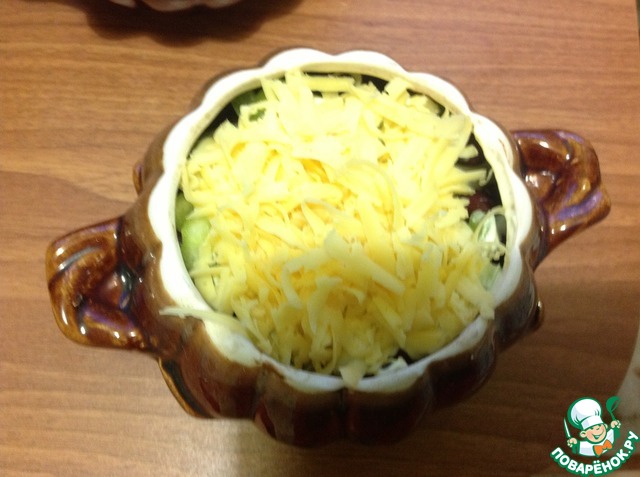 Сверху сыр. Горшочек закрыть крышкой и отправить в духовку на 40 мин при 200 градусов