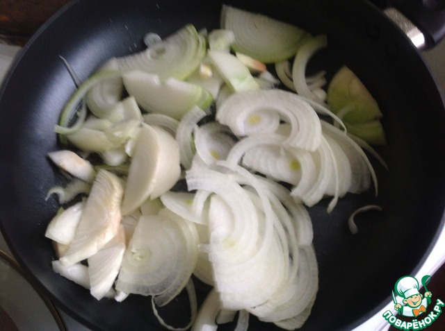 Лук режем полукольцами и ставим обжаривать в оливковом масле 3 минуты