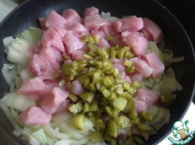 Филе индейки режем небольшими кубиками, огурца мелко нарезаем и добавляем все к луку вместе с солью и перцем, перемешиваем и тушим на среднем огне 5-7 мин