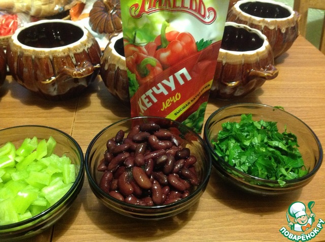 Теперь все послойно выкладываем в горшочки. Сначало мясо и сверху выкладываем ложку лечо
