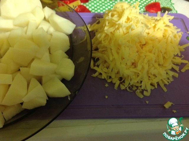 Сыр трем на терке, картофель режем небольшими кубиками