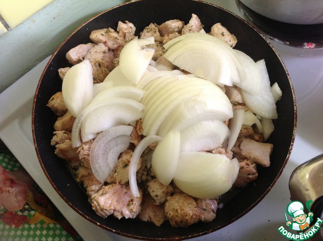 Затем добавляем лук порезанный полукольцами, и тушим еще минут 5-7